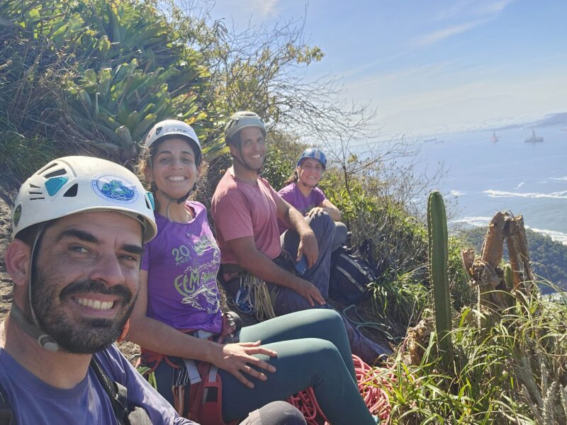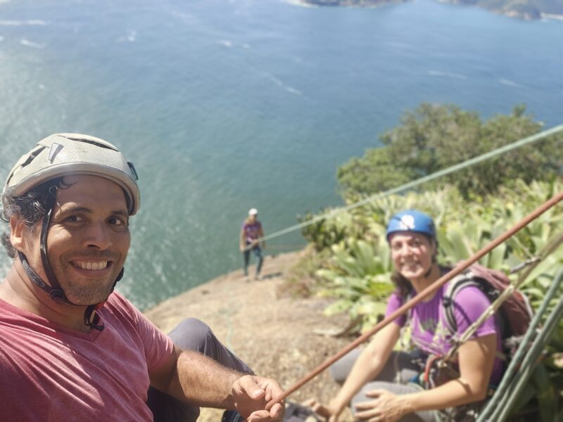 Fomos ao seu encontro e, quando chegamos, a trilha sonora que nos embalava do celular do Magal era Orange Sky, do Alexi Murdoch, e depois Caminhos do Mar, da Gal Costa, em homenagem à rainha do mar. Alegres e tranquilos, puxamos o Leandro e nos juntamos novamente. Dividimos água, guardamos os equipos e buscamos o caminho rumo ao cume do Pão de Açúcar.