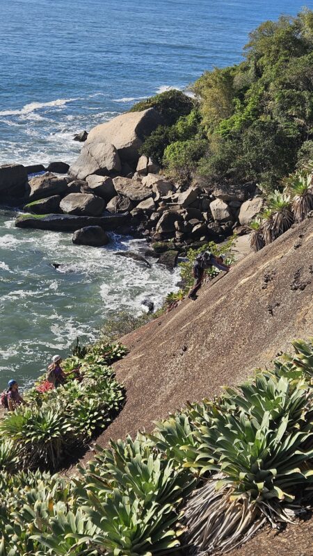 Chegamos à base da via, nos equipamos em duas cordadas (Magal e Bel, eu e Leandro) e veio a surpresa: a garrafa de água do Leandro estava furada e parte do conteúdo já tinha vazado. Ele guardou o recipiente de ponta cabeça para evitar maiores perdas e nos preparamos para começar. Magal sugeriu sair na frente para ajudar na orientação e eu ir na sequência, com as cordadas intercaladas. Ele foi e eu segui logo atrás. A navegação da via não é óbvia: a saída é em horizontal para a direita sem grampos visíveis. Iniciei o caminho para a direita e, quando comecei a pensar: “se eu cair aqui, vou bater no mar”, finalmente apareceu o primeiro grampo. Ufa. O trecho é composto por muitas agarras e bromélias, e a vista mágica de um mar azulzíssimo como plano de fundo. Continuei pela horizontal até que vi o Magal na P1. Costurei e desci até ele desescalando, já que a primeira parada fica abaixo da linha da via. Me prendi, recolhi a corda e chamei o Leandro. Nessa hora, Anabel já estava quase chegando na última costura antes da parada, desceu costurada e sobrou para o Leandro recolher tudo. Ele chegou logo na sequência e foi o único que teve que fazer a descida com risco de queda (antes dele, nós três tínhamos descido presos na costura). Respirou fundo e desescalou calmamente até nós.