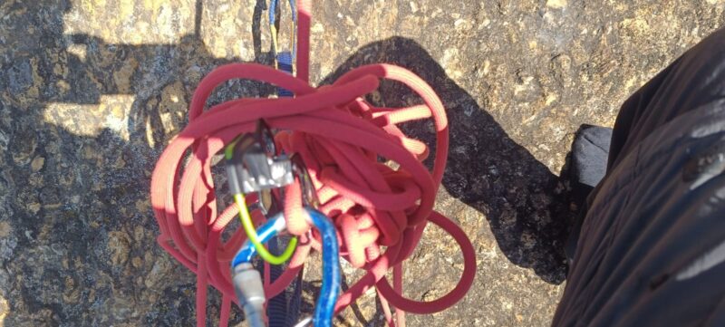 Magal saiu e fui atrás em direção à P9, emendando dois esticões. Comecei a sentir a exposição nesse trecho, que tinha 4 grampos em 60m. Apesar de ser fácil, a parede estava bem suja e a corda, muito pesada. Subi reto e, na sequência, toquei para a diagonal direita torcendo para os musguinhos não cederem e eu cair 20m. Nessa hora, eu já estava tendo que escalar sem uma das mãos, que estava ocupada tentando carregar a corda para conseguir seguir. Em determinado momento, senti até que estava sendo puxada para baixo. Continuei puxando e pedindo corda mas, apesar de colocar toda minha força com as duas mãos para puxar, não saí do lugar. A comunicação não é boa neste trecho. Nesse momento, já estava perto de Bel e Magal, que já estavam na P9, e eles ligaram para o Leandro, que disse que um nó tinha se formado e entrado no freio e que ele não estava conseguindo soltar. Magal fixou a corda dele, me prendi e aguardei o Leandro se desencordar e tirar o nó para seguir.