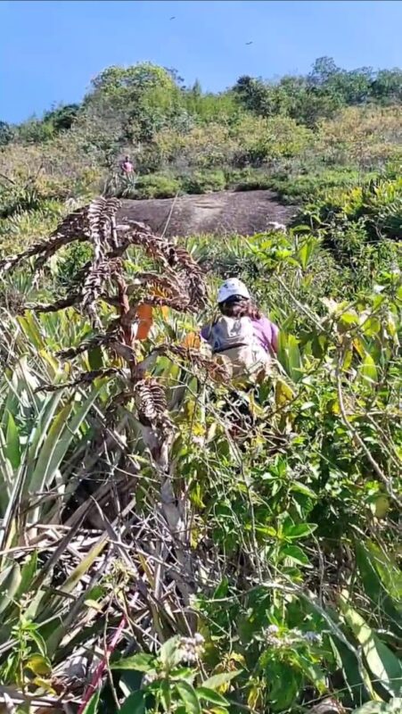 Magal seguiu guiando na frente e Bel logo após, e fui atrás dela. Subimos bastante, achei um único grampo, costurei e continuei seguindo reto por entre as bromélias até voltar a ter que fazer muita força para puxar a corda. Por sorte, Bel estava logo na frente e ligou para o Leandro: a corda tinha acabado. Decidimos francesar até onde o Magal estava. O que passou despercebido por mim é que o grampo 40m acima da P10 já era a P11, e já tínhamos terminado a via. Eu e Bel seguimos varando o mato por entre as bromélias em uma subida aparentemente infinita até que finalmente vimos o Magal.