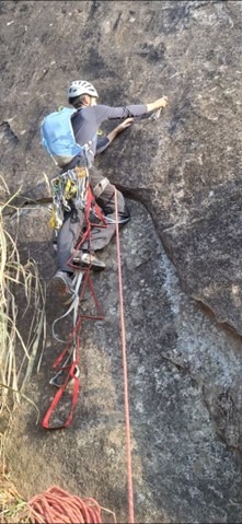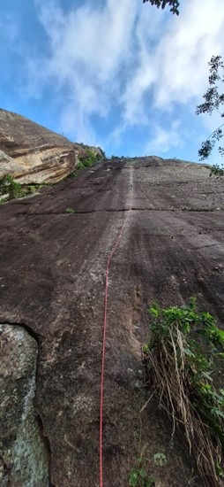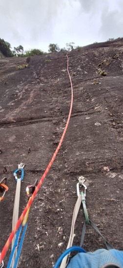 Agilizamos tudo e Henri partiu para guiar o próximo esticão. Esse esticão era desafiador por possuir um negativo que nos gerou maior cansaço, algumas cãibras e uns mini intervalos de descanso.
