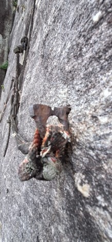 Continuamos nosso revezamento na guiada chegando a P3 às 10h37 e 11h09, a P4 às 12h10 e 12h35 e P5 13h25 e 13h55. Na P5 que é o platô do bivaque fizemos um lanche mais reforçado, reavaliamos o tempo da subida que mesmo a via ficando um pouco mais difícil e demorada por conta da maior quantidade de stubais apodrecidos e a progressão ter passado a ser predominantemente em parafuso ainda chegaríamos ao final da via pouca coisa após as 17h.