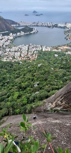 Durante esse esticão o tempo que até o momento era estável se mostrou mais próximo da previsão que era de chuva. As nuvens que pairavam sobre o morro Dois Irmãos por toda manhã começaram a se deslocar com um forte vento e névoa. De repente, tudo ficou cinza e sem visibilidade. Trocamos algumas palavras e decidimos nos agrupar na P6 para ver o que faríamos. Antes mesmo do Henri chegar a P6 as nuvens passaram e o tempo abriu novamente.