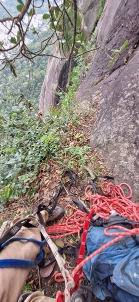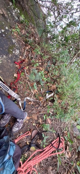 Seguimos a subida da canaleta e chegamos em mais uma corda fixa subindo em diagonal para direita. Ao terminar a corda seguimos uma trilha para direita que acabou no nada.