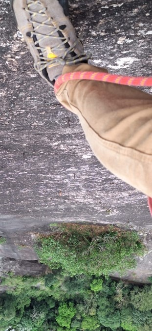 Esse próximo rapel não identificamos corretamente onde estávamos e até onde a corda chegaria. Henri começou a descer, passou por dois grampos e foi em direção ao diedro onde chegou a um platô. Nesse platô ele não achou grampo e havia uma pequena árvore quase que solta que não lembrávamos dela na via. Esse cenário gerou uma grande dúvida se aquele era o local correto ou se era algum ponto no meio da K3 que é toda em móvel e não daria para se ancorar.