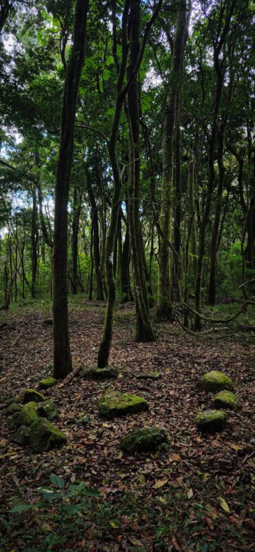Após a pausa no bosque encantado, continuamos e cerca de 50 metros depois foi avistado um ser minúsculo do tamanho da unha do dedão da mão, um adulto, era uma Rãnzinha-do-folhiço (Adenomera sp.) que tem hábitos diurnos e estava em plena atividade buscando seu alimento sobre a serrapilheira da floresta atlântica, a riqueza dos sons dos animais era constante em todos os trechos da floresta, Jacús, Chorózinhos, Choquinhas, Sabiás, Saíras, gaviões e um beija-flor-roxo compunham a trilha sonora da trilha, alguns metros depois havia um conjunto de rochas que formavam belas tocas, que provavelmente, são de alguns moradores felinos que habitam aquela mata.