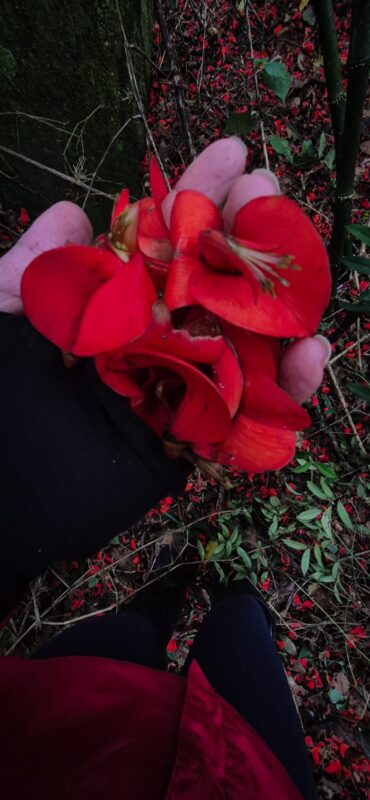 O momento de encontro foi de alegria e paramos todos para lanchar nas pedras de um rio que estava seco, enquanto trocamos histórias dos dois lados. Nesse momento, conhecemos a cachorra que acompanhava o grupo do Vale dos Lúcios, que nos acompanharia até o final, convencida por restos de comida do nosso grupo. Após o encontro e despedida, o grupo do Vale dos Frades seguiu pela trilha já aberta, passando pela Gruta Maior com material abandonado por caçadores e recolhendo as latas de cerveja velhas que haviam sido deixadas na trilha para sinalização. Em certo momento, nos deparamos com um tapete de flores vermelhas que a floresta esticou ao chão para que passássemos, flores da Jade (Erythryna crista-galli) uma árvore em plena floração e se destacando em meio ao verde da floresta. O grupo deu uma última parada no mirante abaixo das Torres de Bonsucesso, contemplando a vista, e seguiu em ritmo forte para o estacionamento. Chegando, devolveram a cachorra à sua casa e conversaram com as crianças da casa, que estavam curiosas como nós levaríamos os carros do grupo que havia passado por ali mais cedo. Detalhe: como não havia garantias que os grupos se cruzariam na travessia, decidimos deixar as chaves dos carros dentro das rodas, para garantir a volta de todos.