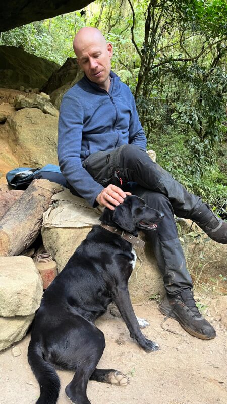 O grupo retomou uma caminhada pesada, liderada por Daniel, com alguns trechos de subida e ainda em trilha já aberta, até o bosque do acampamento, onde paramos para lanchar e começar a abertura de trilha de fato. Cerca de 12h00 começamos a navegar com Daniel abrindo a trilha com um facão, Albedi atrás limpando a trilha e marcando as árvores com um segundo facão, Philipp acompanhando o traçado no GPS e Raissa amarrando fitinhas nas árvores, para facilitar a navegação do outro grupo. A partir daí, o avanço foi bastante lento, pois a trilha já estava completamente fechada, e era majoritariamente atravessando um bambuzal, demandando mais esforço para abertura do caminho.
